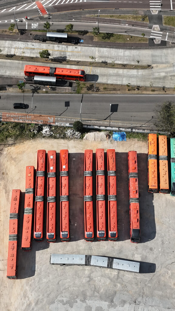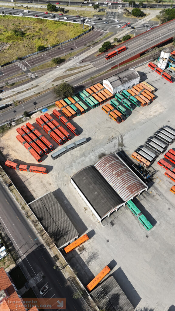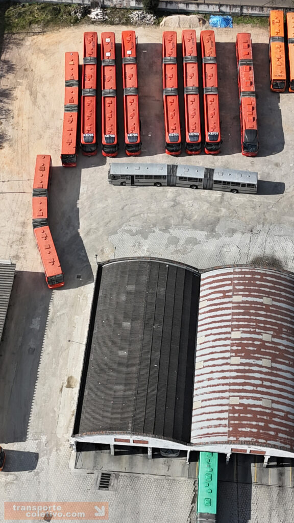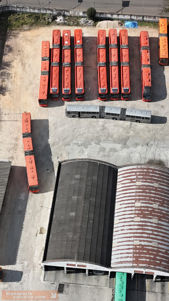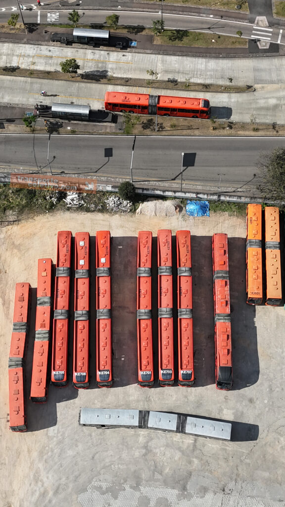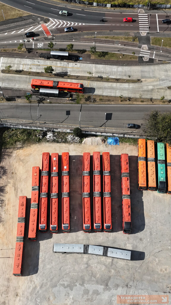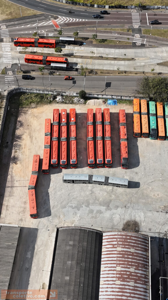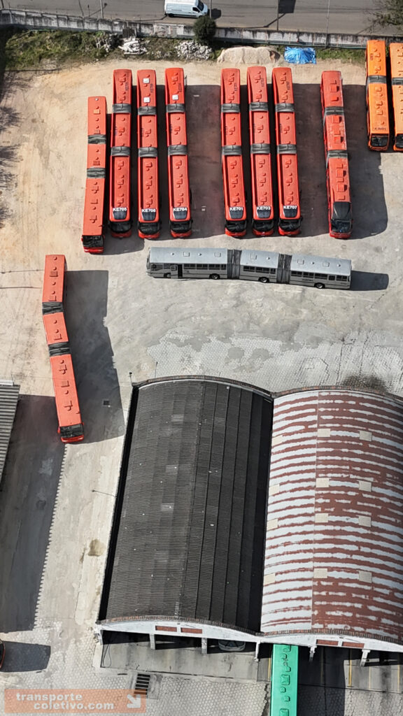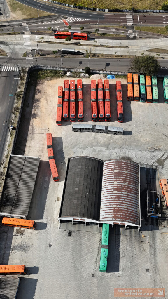 Na garagem da Auto Viação da SÃO JOSÉ dos Pinhais, antiga Viação N. Sra. do CARMO, destaque para o primeiro biarticulado do Brasil, o ED001. Consegue identificá-lo nas imagens?
