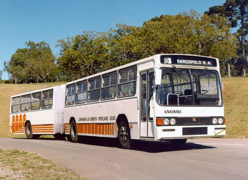 Do acervo de @onibusmarcopolo, o articulado especial – para atendimento de serviço privado da então Companhia de Cimento Portland, veículo fabricado exatamente no início da década de 1980, quando os articulados ainda não eram comuns.